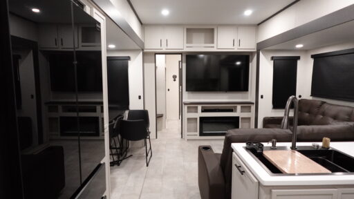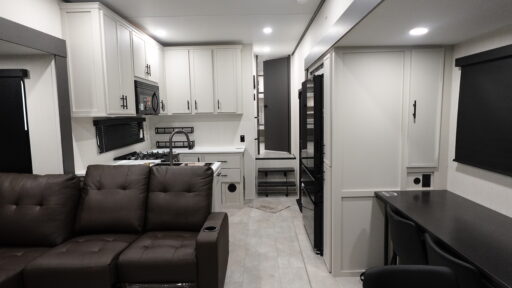 If you enjoy long trips with family and friends, this fifth wheel is sure to meet all of your needs! There is a private bedroom with a king bed slide-out for more space and comfort, plus a front wardrobe. And you will be amazed by the lovely full bathroom behind the barn door next to the bedroom with a double vanity for you and your partner! The living room is made spacious thanks to the dual opposing slides, and you'll find a sectional sleeper sofa here, as well as desk/dinette for meals and even work. And don't overlook the kitchen area with ample counter space, a four burner range, an accessory sink and a French door 12V refrigerator! If you thought it can´t get better, wait until you see the front room that will be the best place to relax and hang out, featuring a sleeper sofa, bunks above, and an entertainment center with a projector for a movie marathon.