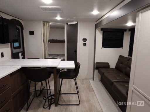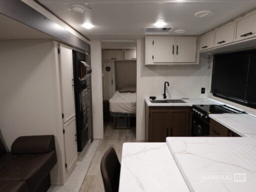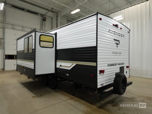 The Avenger 25MKB boasts a spacious center living area, complete with a theater seat for ultimate relaxation and a 50" TV for entertainment. The rear bath offers a shower with a sleek plastic and glass design, ensuring a refreshing experience. With ample storage, including wardrobes and overhead cabinets, you’ll have plenty of room for all your essentials. This RV is your ticket to memorable family adventures, combining practical features with stylish design. For more details, visit your nearest General RV dealership.