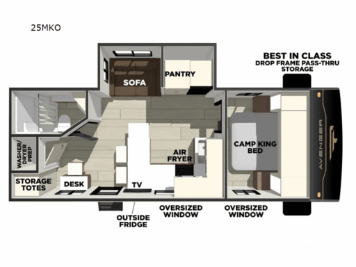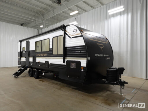 As you make your way to the front, you'll find a serene bedroom complete with a queen bed, promising restful nights after days of adventure. The rear bath offers convenience with its plastic/glass shower enclosure and practical storage solutions. Outside, the powered retractable awning extends your living space, providing shade and comfort for outdoor relaxation. With a length of just under 30 feet and a manageable dry weight, the Avenger 25MKO is perfect for those seeking both mobility and luxury in their travels. For more information or to experience this RV firsthand, visit your nearest General RV dealership.
