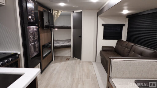 You'll appreciate the added space in this travel trailer thanks to the large slide out! The booth dinette and sofa are found here, and there is a moveable storage ottoman for extra blankets or board games. You'll have your own space up front in the private bedroom, complete with a camp king bed and storage for your things, while your guests take the double-size bunk beds towards the back. The chef of your group will find a three burner cooktop and a built-in convection microwave with an air fryer to cook meals, plus there is a 12V refrigerator and large hidden pantry for food storage. This unit also includes a power awning outdoors and an outside refrigerator to keep cold drinks close by.