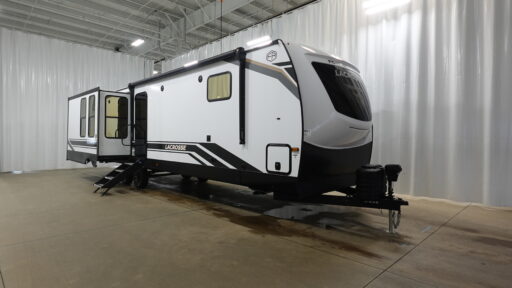 The LaCrosse 3411RK is designed with relaxation in mind. The center living area features a cozy theater seat and a hide-a-bed, perfect for unwinding after a day of adventure. A fireplace adds a touch of warmth and ambiance, making it a great spot to curl up with a good book or enjoy a movie night. With three slides, the interior is spacious and airy, providing plenty of room to move around. The 16 ft. powered retractable awning extends your living space outdoors, offering shade and shelter as you enjoy the great outdoors.