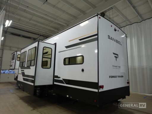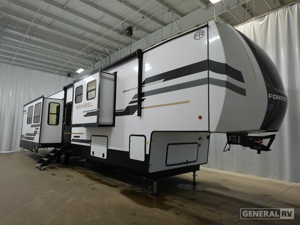 The Sanibel series stands out with a combination of unique and highly functional exterior and interior features designed for both convenience and durability. On the outside, a drop-frame pass-through storage area with a rubberized liner offers ample space while protecting your gear from moisture and wear. Setting up camp is effortless thanks to the one-touch auto-leveling system and rubberized suspension equalizer, which provide a smooth and stable foundation. Inside, comfort meets practicality with carpet less slides for easy cleaning and blackout roller shades for privacy and temperature control. The real wood cabinet doors and solid surface countertops add a touch of elegance, no matter where the road takes you.