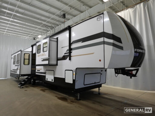 The Sanibel series stands out with a combination of unique and highly functional exterior and interior features designed for both convenience and durability. On the outside, a drop-frame pass-through storage area with a rubberized liner offers ample space while protecting your gear from moisture and wear. Setting up camp is effortless thanks to the one-touch auto-leveling system and rubberized suspension equalizer, which provide a smooth and stable foundation. Inside, comfort meets practicality with carpet less slides for easy cleaning and blackout roller shades for privacy and temperature control. The real wood cabinet doors and solid surface countertops add a touch of elegance, no matter where the road takes you.