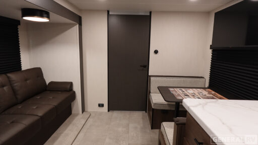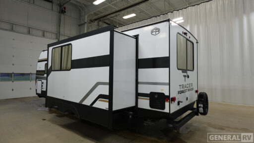 Retreat to the private bedroom, where a luxurious camp king bed awaits, surrounded by generous wardrobe and overhead storage. The bathroom is well-appointed, ensuring you have all the comforts of home wherever you go. With a single slide-out, this RV maximizes living space without sacrificing mobility. The 29-foot length and sleek design make it easy to tow and park, while the 42-gallon fresh water capacity ensures you're ready for extended stays in the great outdoors. Discover the freedom of the open road with the Tracer 235RK, and let every journey become a cherished memory. For more details, visit your nearest General RV dealership.