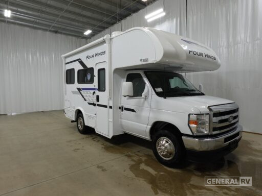 Inside, the Four Winds 19Z features a well-thought-out floor plan that maximizes space and functionality. The rear of the motorhome houses a comfortable dinette that can be converted into a sleeping area, providing flexibility for dining and rest. The kitchen is equipped with essential appliances, including a refrigerator, microwave oven, and a two-burner gas cooktop, facilitating convenient meal preparation on the go. A compact bathroom offers necessary amenities without occupying excessive space. Additional features such as a 7-inch touchscreen dash radio with Bluetooth®, Android Auto™, and Apple CarPlay® compatibility enhance the overall travel experience, making the Four Winds 19Z a practical choice for those seeking adventure without compromising on comfort.