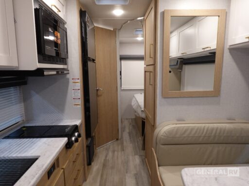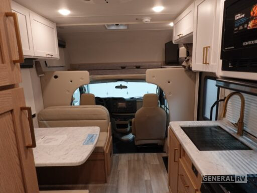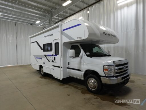 Inside, the Four Winds 22Z features a thoughtfully designed floor plan that maximizes living space. The rear of the motorhome houses a queen-size bed, providing a comfortable sleeping area. Adjacent to the bedroom is a fully equipped bathroom with a shower, toilet, and sink, offering all the necessary amenities for convenience on the road. The living area includes a Dream Dinette® that can be converted into an additional sleeping space, accommodating extra guests. The kitchen is equipped with essential appliances, including a refrigerator, microwave oven, and a three-burner gas cooktop with an oven, allowing for meal preparation during travels. Additional features such as a 7-inch touchscreen dash radio with Bluetooth®, Android Auto™, and Apple CarPlay® compatibility enhance the overall travel experience, making the Four Winds 22Z a practical and comfortable choice for adventurers.