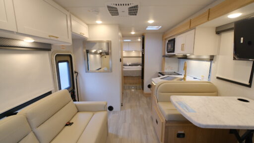 The heart of this RV is its center kitchen, equipped with a mid-size electric refrigerator and a three-burner cooktop, making meal preparation a breeze. Whether you’re cooking a feast or a quick snack, you’ll find everything you need at your fingertips. The rear bedroom offers a peaceful retreat with a queen bed surrounded by ample storage. Enjoy the convenience of a center bath with a shower curtain, ensuring privacy and comfort. The 14 ft. powered retractable awning extends your living space outdoors, perfect for enjoying the scenery or hosting a barbecue. With a fuel capacity of 55 gallons and a GVWR of 14,500 lbs, this motorhome is ready to take you wherever your heart desires. For more information, visit your nearest General RV dealership.