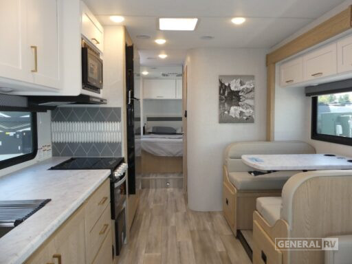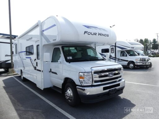The center kitchen is equipped with a three-burner cooktop and a mid-size electric refrigerator, ensuring you have all the amenities needed to prepare your favorite meals on the road. The rear bedroom offers a peaceful retreat with ample storage, including closets and a dresser. The 16 ft. powered retractable awning extends your living space outdoors, allowing you to enjoy the beauty of nature in comfort. Built on a sturdy Ford E450 chassis with a powerful 325 horsepower engine, the Four Winds 31WV is ready to take you on your next journey with confidence and style. For more details, visit your nearest General RV dealership.