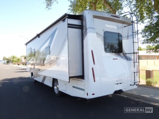 Retreat to the rear bedroom, where a luxurious king-size bed awaits, providing a restful escape. The clever design continues with a drop-down overhead bunk, adding versatile sleeping space without compromising on comfort. Enjoy the convenience of a center bath with a stylish shower, and take advantage of the prepped washer/dryer area for added convenience. Outside, the 18-foot powered retractable awning creates the perfect shaded oasis, whether you’re enjoying the exterior kitchen or catching a game on the exterior TV. Powered by a robust Ford F53 chassis with 335 horsepower, this gas-fueled RV is ready to take you wherever the road leads. For more information, visit your nearest General RV dealership.