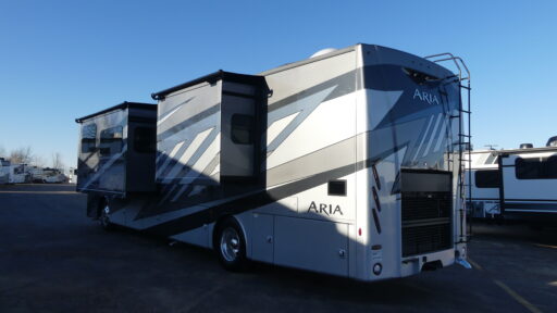 The Aria 3901 is designed for comfort and convenience, featuring a front living area with reclining theater seating and a fireplace, creating a cozy atmosphere for relaxation. The retractable TV and additional exterior TV ensure entertainment is always at your fingertips. A center bathroom with a stylish plastic/glass shower and a stackable washer/dryer add to the home-like feel. With a robust Freightliner XC-Series chassis and a powerful Cummins I6 Diesel Pusher engine, this RV promises a smooth ride. Whether you're lounging under the 20 ft. powered retractable awning or exploring the open road, the Aria 3901 offers an unparalleled RV experience. For more details, visit your nearest General RV dealership.