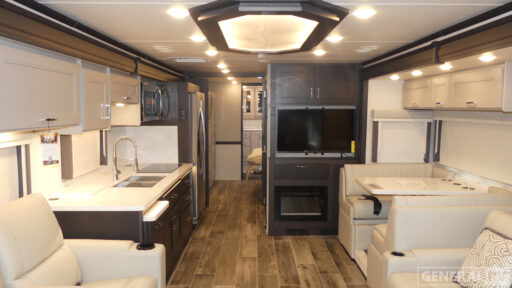 The Aria 3901 is designed for comfort and convenience, featuring a front living area with reclining theater seating and a fireplace, creating a cozy atmosphere for relaxation. The retractable TV and additional exterior TV ensure entertainment is always at your fingertips. A center bathroom with a stylish plastic/glass shower and a stackable washer/dryer add to the home-like feel. With a robust Freightliner XC-Series chassis and a powerful Cummins I6 Diesel Pusher engine, this RV promises a smooth ride. Whether you're lounging under the 20 ft. powered retractable awning or exploring the open road, the Aria 3901 offers an unparalleled RV experience. For more details, visit your nearest General RV dealership.