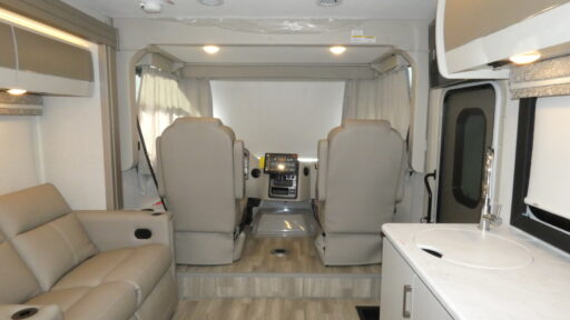 Inside, you'll find a welcoming front living area with theater seating and a removable pedestal table, ideal for relaxing or entertaining. The center kitchen is equipped with a mid-size electric refrigerator and a two-burner cooktop, making meal prep a breeze. The rear bedroom features a cozy queen-size bed flanked by ample closet space, providing a restful retreat after a day of exploration. With additional sleeping space from the drop-down overhead bunk, this motorhome comfortably accommodates up to three people. Enjoy the outdoors under the 18-foot powered retractable awning, making every trip a blend of luxury and adventure. For more details, visit your nearest General RV dealership.