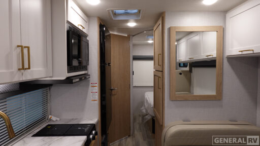 It won't be hard to find comfort in this coach for five! You can freshen up in the rear corner full bath once you've set up camp, then make lunch on the two burner gas cooktop or convection microwave with an air fryer. There is also a 12V refrigerator for cold items and a flip-up countertop for more space. Whether you dine at the Dream Dinette or take your plate outdoors under the 15' power awning, you're sure to have a great time in this motorhome. There is a semi-private bedroom with a 60" x 74" RV queen bed slide and bedroom TV prep if you want the option to watch movies in bed. And your guests can take the Dream Dinette and cab-over bunk at night!
