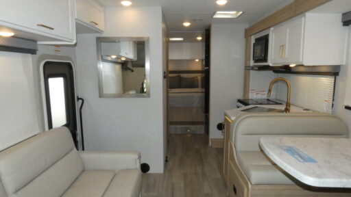 The heart of this RV is its center kitchen, equipped with a mid-size electric refrigerator and a three-burner cooktop, making meal preparation a breeze. Whether you’re cooking a feast or a quick snack, you’ll find everything you need at your fingertips. The rear bedroom offers a peaceful retreat with a queen bed surrounded by ample storage. Enjoy the convenience of a center bath with a shower curtain, ensuring privacy and comfort. The 14 ft. powered retractable awning extends your living space outdoors, perfect for enjoying the scenery or hosting a barbecue. With a fuel capacity of 55 gallons and a GVWR of 14,500 lbs, this motorhome is ready to take you wherever your heart desires. For more information, visit your nearest General RV dealership.