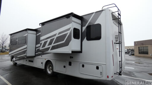 The Hurricane 35G offers a well-planned layout with a center bedroom and a rear/center bath, providing privacy and convenience. With the inclusion of washer/dryer prep, extended journeys are made easier. An 18 ft. powered retractable awning creates an inviting outdoor space, ideal for enjoying the scenery or hosting friends. Built on a robust Ford F53 chassis, this RV boasts a powerful 335 horsepower engine and an impressive 8,000 lbs towing capacity, making it a reliable companion for all your adventures. For more information or to experience the Hurricane 35G in person, visit your nearest General RV dealership.