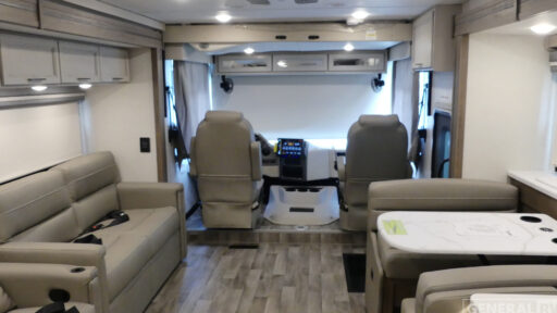 This motorhome is designed for comfort and convenience throughout. At the front, swivel cockpit chairs with a stow-away coffee table create a relaxing space for quiet mornings, while the overhead drop-down bunk offers a comfortable sleeping area for guests. The main living area features generous seating, including 68" theater seating with side tables, a 68" sofa bed, a pantry, and a cozy fireplace. Across from it, the 68" Dream Dinette is perfect for dining, games, or additional sleeping space, and a 50" LED Smart TV on a Televator provides entertainment after a day of adventure. The kitchen is well equipped with a three-burner cooktop, 30" over-the-range microwave, and a side-by-side refrigerator. A centrally located half bath adds convenience, while the rear bedroom offers a tilt a view 72" x 80" king bed in a slide-out, along with a closet, TV, and a full rear bathroom for complete comfort on the road.