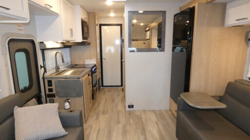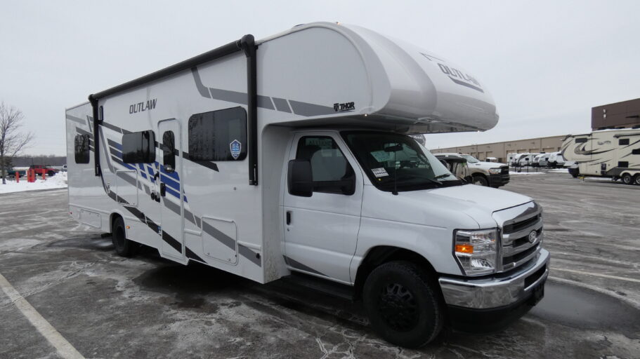 Step into the 2026 Thor Motor Coach Outlaw 29J and experience the perfect blend of luxury and adventure. This versatile Class C motorhome offers a unique layout that caters to your every need, whether you're hitting the open road or setting up camp. With its spacious interior, this RV comfortably sleeps up to eight, featuring a full-size bed, a queen-size drop-down bunk, and two convertible sleeping areas. The front living area is designed for relaxation, complete with a 70" jack-knife sofa and captain's chairs that swivel for optimal comfort and socializing.