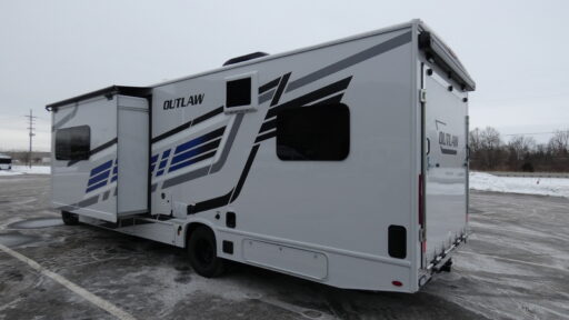 The heart of the Outlaw 29J is its well-appointed center kitchen, equipped with a three-burner cooktop and mid-size electric refrigerator, making meal prep a breeze. The bathroom, conveniently located in the center, features a shower with a curtain, ensuring privacy and ease of use. One of the standout features is the rear patio deck, perfect for enjoying the great outdoors while maintaining the comforts of home. With a 16 ft. powered retractable awning, you can create a cozy outdoor space in moments. Built on a robust Ford E450 chassis, this RV delivers a powerful driving experience with 325 horsepower and 450 torque, ensuring you can tow up to 8,000 pounds with ease.