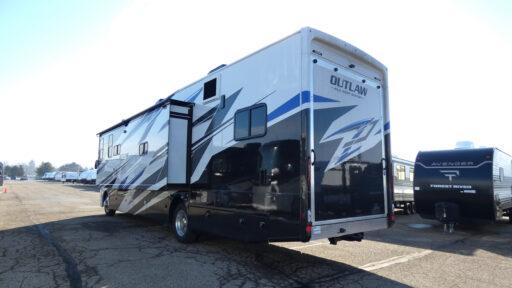 With any Outlaw Wild West Edition Class A gas toy hauler by Thor Motor Coach, you will have a capable and powerful motorhome for all your adventures. There is a vacu-bond laminated roof, walls, and floor with block foam insulation, a premium one-piece domed roof membrane, and a welded tubular steel floor for added strength. You will love having an 8,000 lb. trailer hitch for your towing needs, and the air ventilation sidewalls vents in the garage will be appreciated when gas and oil odors are present. Head inside to find residential vinyl flooring, full extension soft close metal ball-bearing drawer guides, and solid surface countertops in the kitchen. Some of the cockpit features the driver will enjoy are the 10.1" touchscreen dash radio, the blind spot detection, and the back-up monitor for easier parking. The RapidCamp+ multiplex wiring control system with a 7" screen also comes standard, along with an Onan RV QG 5500 gas generator with automatic generator start for added convenience. More utilities include a tankless water heater, a whole coach water filtration system, a 100-watt solar charging system, and more!
