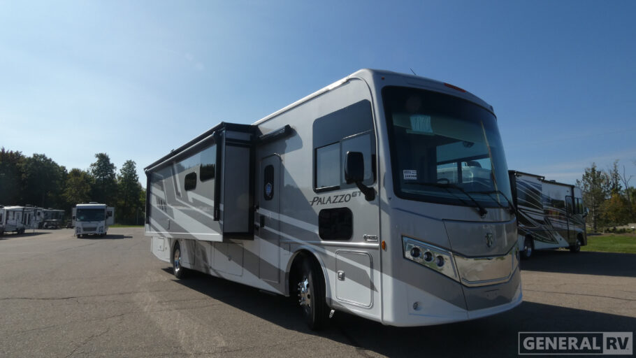 The Palazzo GT 37.5 is thoughtfully designed with two slides to maximize space and comfort. The rear and center bath offer convenience with a well-appointed shower, while the center bedroom provides a tranquil retreat with a Tilt-A-View queen bed. The 18 ft. powered retractable awning creates an inviting outdoor space, perfect for enjoying the great outdoors. With a 95-gallon fresh water capacity and ample gray and black water storage, extended adventures are easily within reach. This motorhome is also prepped for a washer and dryer, adding to its residential comforts. To explore this exceptional RV further, visit your nearest General RV dealership and start your journey in style.