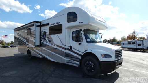The center kitchen is a culinary enthusiast's dream, equipped with a full-size refrigerator and a convection microwave, ensuring you can whip up delicious meals on the road. The rear bedroom is a sanctuary of relaxation, boasting a king-sized bed with a Tilt-A-View feature for added comfort. With washer/dryer prep and plenty of storage, this RV is designed for extended adventures. The 17 ft. powered retractable awning and exterior TV make outdoor living as enjoyable as the indoors. Powered by a robust Cummins engine on a Freightliner S2RV chassis, the Pasadena 38FX delivers a smooth and powerful ride, ready to take you wherever your heart desires.
