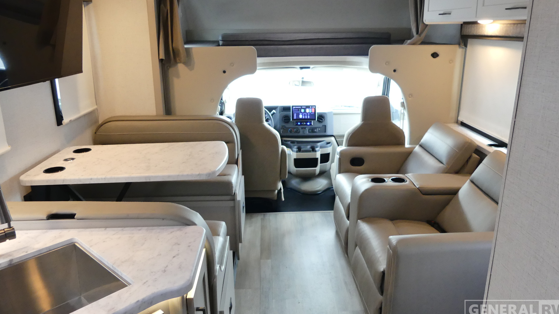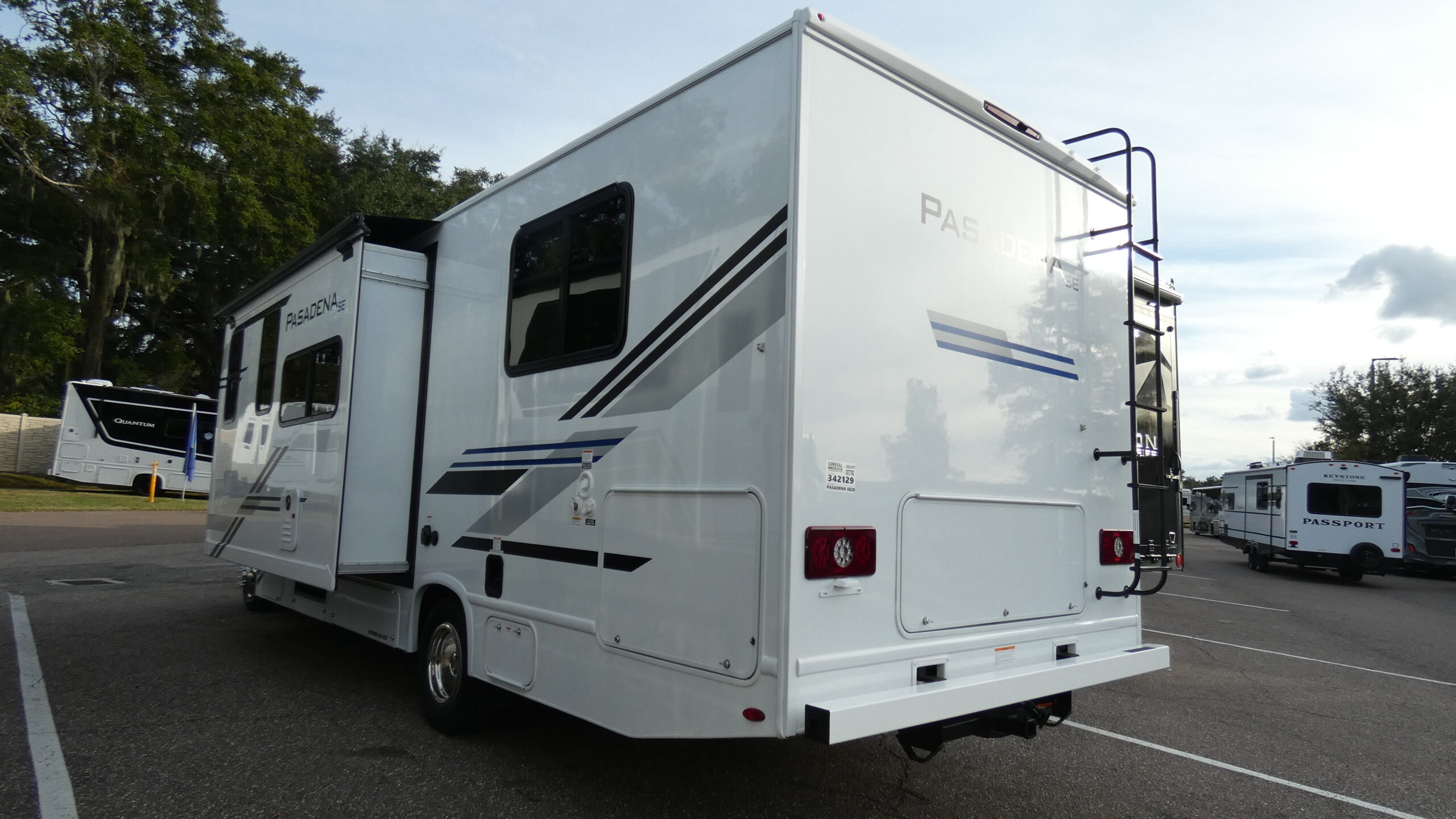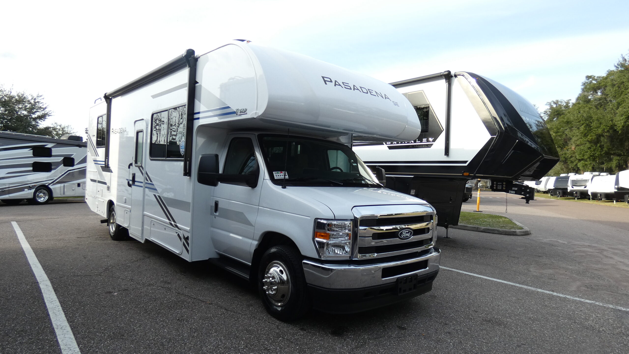 With any Pasadena SE Class C gas motorhome by Thor Motor Coach, you will find convenient amenities, a modern interior, and a reliable Ford E-Series chassis, to power your adventures. There is a one-piece fiberglass front cap, and premium one-piece roofing for added strength. Residential vinyl flooring will be easy to keep clean, and you'll love the LED lighting, pressed laminate countertops throughout, and full-extensions ball-bearing drawer guides. These motorhomes also include a generator and a 30-amp shoreline power cord to keep you going, along with a tankless water heater to ensure your comfort!