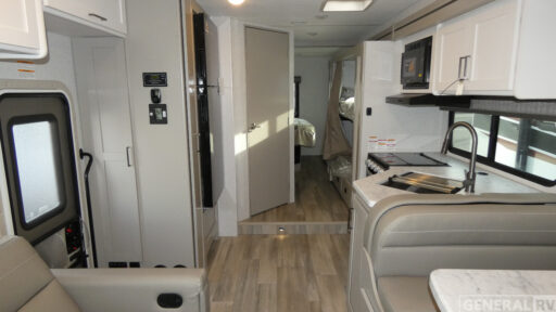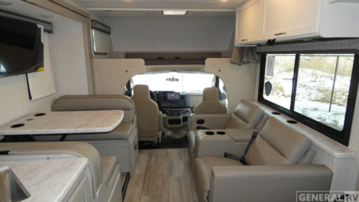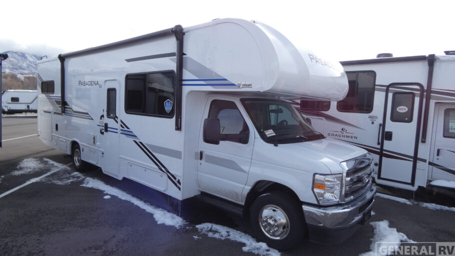 With any Pasadena SE Class C gas motorhome by Thor Motor Coach, you will find convenient amenities, a modern interior, and a reliable Ford E-Series chassis on select models to power your adventures. There is a one-piece fiberglass front cap, and premium one-piece roofing for added strength. Residential vinyl flooring will be easy to keep clean, and you'll love the LED lighting, pressed laminate countertops throughout, and full-extensions ball-bearing drawer guides. These motorhomes also include a generator and a 30-amp shoreline power cord to keep you going, along with a tankless water heater to ensure your comfort!