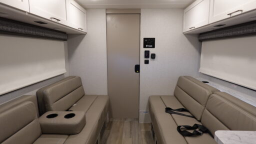 It won't be hard to find comfort in this coach for three! You can freshen up in the rear wetbath once you've set up camp, then make lunch on the two burner gas cooktop or convection microwave with an air fryer. There is also a 12V refrigerator for cold items and a flip-up countertop for more space. Whether you dine at the removable tables or take your plate outdoors under the 12' power patio awning with integrated LED lighting, you're sure to have a great time in this motorhome. The mid-coach bedroom boasts two twin beds with a full-size bed conversion, plus there is a 32" Smart TV on manual swivel over the cab if you want the option to watch shows in bed. And any guests you may have can sleep on the 52" x 91" cab-over sleeping space!