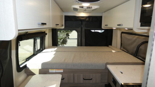 Two-Burner Gas Cooktop Flip-Up Bed with Mega Storage Lagun Table System Swivel Captain's Seats