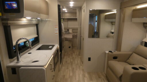 This coach has a similar layout to 24.1, but you'll enjoy theater seating in this model, two closets instead of one, and a larger exterior length for more space! The twin beds with king conversion make it possible to travel as friends or a couple, and there is even a bedroom TV so you can watch movies in bed. In the morning, you can make breakfast on the two burner gas cooktop or in the convection microwave with an air fryer. There is a 12V double door refrigerator to keep your perishables fresh, and you can dine at the theater seating.