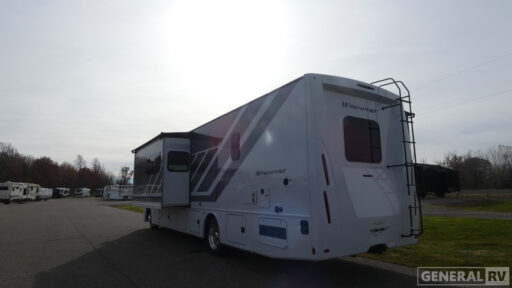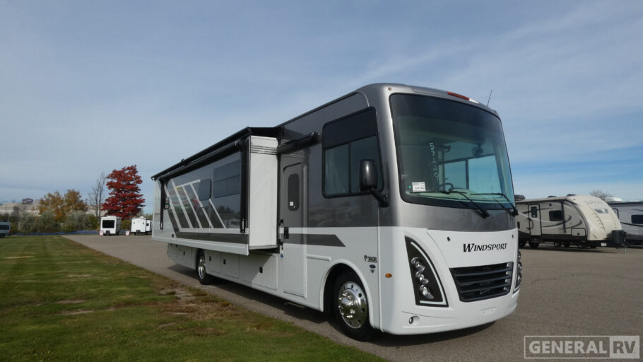As you move towards the rear, you'll find a serene bedroom retreat with a luxurious king-sized bed, complemented by ample storage and a stackable washer/dryer, making extended trips a breeze. The 35R's two slide-outs enhance the living space, providing room for a convertible sofa bed and a dream dinette that comfortably sleeps up to eight. With a robust Ford F53 chassis, 335 horsepower, and an 8,000-pound towing capacity, your adventures are powered with confidence. The 18-foot powered retractable awning extends your living space outdoors, perfect for enjoying sunny days. Discover the perfect blend of comfort and adventure with the Windsport 35R, and experience the open road like never before. For more details, visit your nearest General RV dealership.