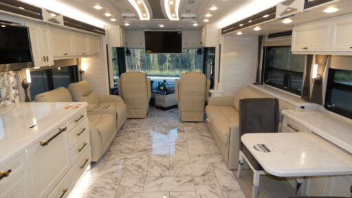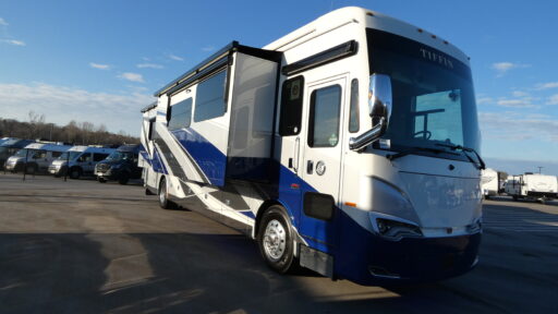 With any Allegro Bus Class A diesel coaches by Tiffin Motorhomes you will experience ultimate luxury, breakthrough technology, and unmatched power thanks to the 450 HP Cummins L9 engine. The captain's job is made easier than ever with the adaptive cruise control, the collision mitigation with forward warning and active braking, and the Valid instrument cluster display with integrated leveling controls. This hydronic heating and electronic appliance-equipped coach features two Girard roof awnings, an Onan 10.0 kW generator, and three 15,000 BTU A/C units to keep you comfortable all year long. New and exciting features include a drawer-style dishwasher on each model, Gold Heat dual zones heated tile floors, Starlink Pro with a subscription, and more!