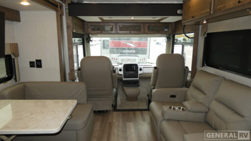 Inside, the Open Road Allegro is designed for relaxation and entertainment. The front living area features theater seating and a booth dinette that converts into an additional sleeping space. With accommodations for up to seven, including a king bed, you'll have plenty of room for family and friends. The center bath offers convenience with its stylish plastic and glass shower. Built on a robust Ford F53 chassis with a 335-horsepower engine, this RV delivers power and reliability, making it a fantastic choice for both weekend getaways and extended adventures. For more information, visit your nearest General RV dealership.