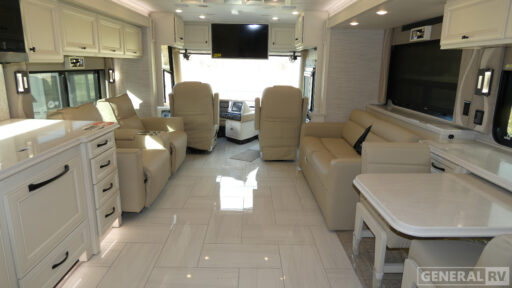 Inside, the Phaeton 40 IH is a marvel of modern convenience and style. The central kitchen is equipped with a full-size electric refrigerator, a convection microwave, and a three-burner cooktop, making meal preparation a breeze. The spacious front living area boasts comfortable seating, ideal for relaxing or entertaining. The rear bedroom features a luxurious king bed, while the center bath offers a tri-view mirror and stacked drawers for added convenience. With a powered retractable awning, washer/dryer, and ample storage throughout, this RV is designed for both comfort and adventure. For more information, visit your nearest General RV dealership.