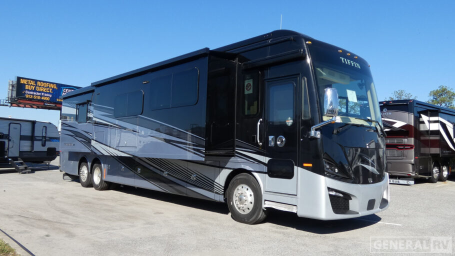 The Phaeton 44 OH boasts a sophisticated interior with a front living area that features a cozy air coil sofa bed and a convertible dinette, making it ideal for entertaining or relaxing. The center bedroom offers the choice between a king or queen bed, ensuring restful nights under the stars. The rear bath, complete with a plastic/glass shower and closet, adds a touch of home-like comfort. With a 100-gallon fresh water capacity and a powered retractable awning, this RV is perfectly suited for extended adventures. For more information and to experience the Tiffin Phaeton 44 OH firsthand, visit your nearest General RV dealership.