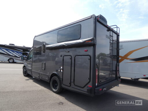 The rear bedroom offers twin beds with ample storage underneath, while the center bath boasts a unique pivoting lavatory wall and a shower with a curtain, ensuring privacy and convenience. The 13 ft. powered retractable awning allows you to enjoy the great outdoors in style, providing shade and comfort. Built on a sturdy Ford Transit chassis and powered by an EcoBoost V6 engine, the EKKO delivers both power and efficiency, making it ideal for those long road trips. With a towing capacity of 5000 lbs and a generous fresh water capacity of 50 gallons, this RV is ready to take you wherever your heart desires. Visit your nearest General RV dealership to experience the Winnebago EKKO 22A for yourself!