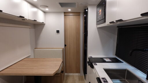 The full bathroom with a standard shower adds real everyday convenience, while smart storage solutions throughout help keep gear organized. Outside, a power patio awning with integrated LED lighting expands your living space, and premium touches like USB/USB-C charging ports and a JBL sound system bring modern comfort and connectivity to every adventure.