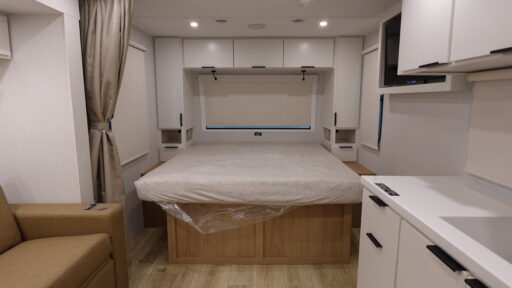 The front bedroom is a true sanctuary, boasting a plush king-size bed that promises restful nights under the stars. The convertible seating area provides additional sleeping space, accommodating up to four guests comfortably. The rear bath is both stylish and functional, with a plastic/glass shower that offers a refreshing start to your day. With a 14 ft. powered retractable awning, you can extend your living space outdoors, perfect for relaxing in the shade. With ample storage, a robust fresh water capacity of 49 gallons, and a cargo capacity of 1260 lbs, the THRIVE 18FBS is ready to support all your travel needs. For more details, visit your nearest General RV dealership.