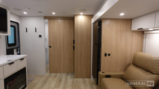 Up front, the private bedroom features an Olympic queen bed with nightstands, wardrobe storage, and pocket door access for easy separation from the living space. The central kitchen is well equipped with a three‑burner cooktop, microwave, pantry, pull‑out trash and recycling, and a 12‑volt refrigerator, making it ideal for extended stays. With Winnebago’s quality construction, tankless water heater, solar capability, and smart use of space, the Thrive 22RBS is an excellent choice for campers looking for a comfortable, modern travel trailer designed around everyday livability.