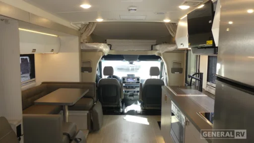 This thoughtfully designed 24D floorplan blends comfort, versatility, and smart use of space, making it ideal for couples or families on the move. The front cabover bunk provides a dedicated sleeping area or extra storage, while the slide-out theater seating opens up the main living space and creates a comfortable spot to relax. The U-shaped dinette offers ample seating for meals or work and easily converts for additional sleeping when needed.