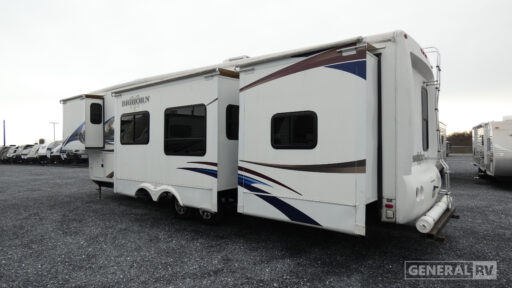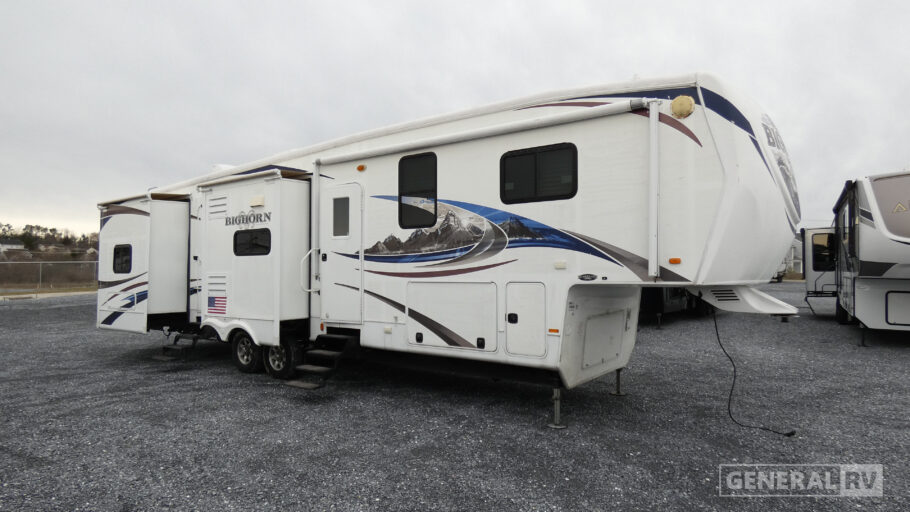 Quad Slide Bighorn Bunkhouse Fifth Wheel w/1-1/2 Baths, Rear Dbl. Sofa Slides w/Bunk Above, Wardrobe, Ent. Center, 1/2 Bath w/Private Entry, Dinette w/Chairs Slide, Kitchen Island w/Dbl. Sinks, Refrig. & 3 Burner Range Slide, Ent. Center w/LCD TV, Step Up to Side Aisle Bath w/Angle Shower, Toilet & Sink & Dbl. Entry, Front Queen Bed Slide, Dresser, Walk-In Closet w/Shoe Storage & Washer/Dryer Prep and Much More!