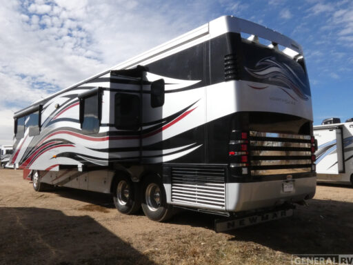 This Triple Slide Mountain Aire Class A motorhome offers a spacious and thoughtfully designed floorplan loaded with residential comforts and abundant storage. The rear private bathroom features a private toilet, corner shower, vanity, and wardrobe space with sliding mirror doors, creating a comfortable and functional master suite area.