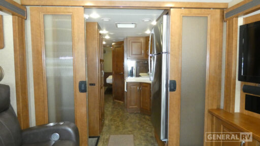Step inside and find a front living room beyond the cab area featuring dual opposing slides. The door side slide features a sofa with air bed as well as overhead storage. The opposite side features a slide with an electric fireplace with a remote and a 40" LED TV just above. Pocket doors separate the living space from the kitchen for added convenience when using the room for sleeping space. There is also an optional overhead bunk above the cab area for even more sleeping space for guests.