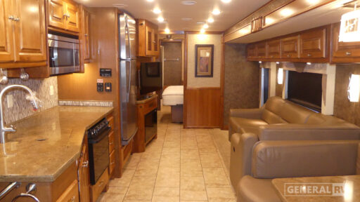 The Allegro 36 LA comfortably sleeps six, featuring a queen bed and two convertible sleeping areas, making it perfect for family getaways. The rear and center bath layout, along with the washer/dryer, adds convenience to your travels. With ample fresh, gray, and black water capacities, and the robust Ford F-Series Super Duty chassis powered by a Triton V10 engine, this RV is built for both comfort and adventure. Whether you're exploring the open road or setting up camp, the Allegro 36 LA offers a seamless blend of style and functionality. For more details, visit your nearest General RV dealership.