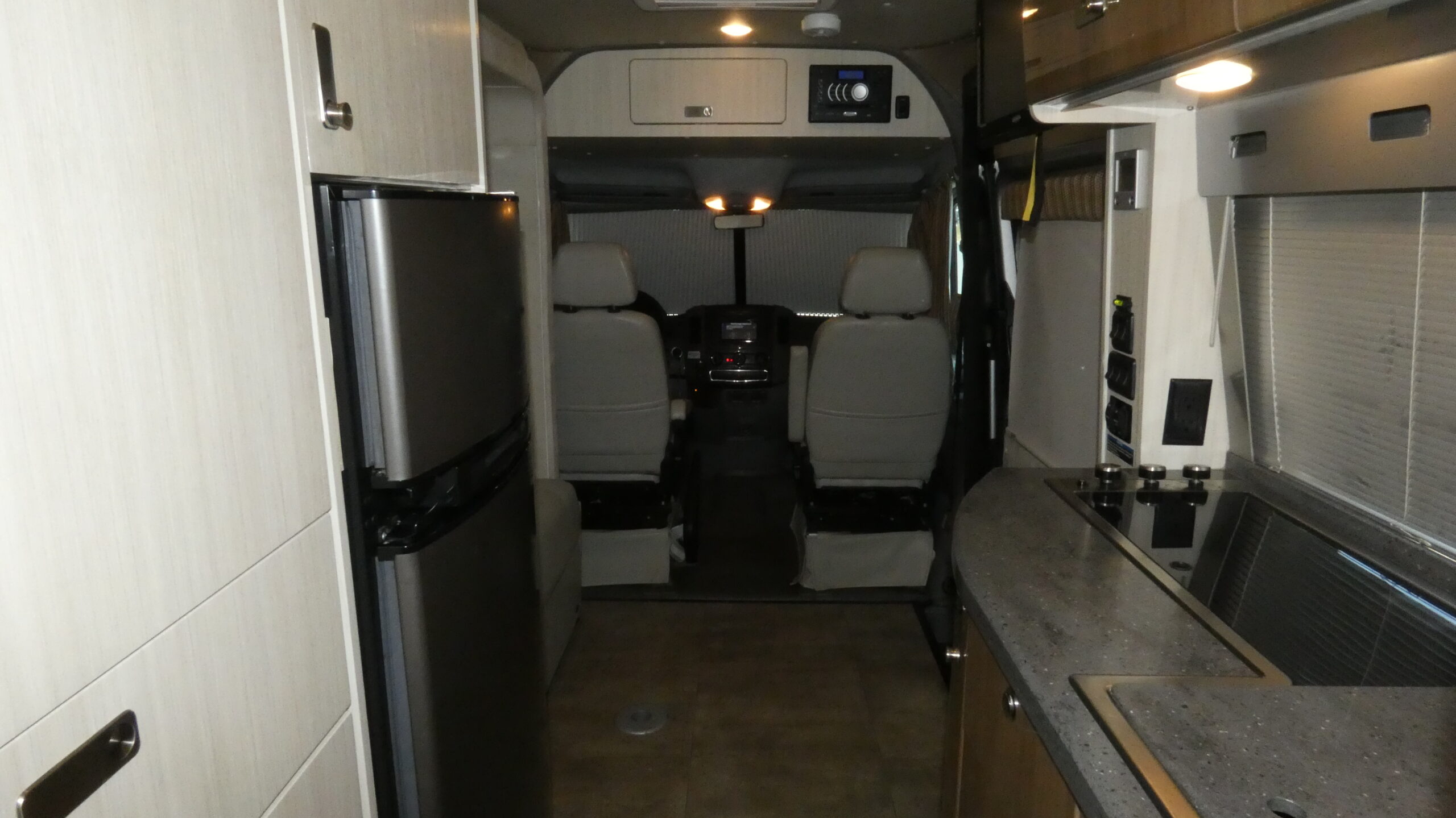Step inside through the side sliding door and see the generous interior space with the slide out sofa sleeper fully expanded. There is a pedestal table for dining, and the front cab seats swivel to the back for more seating also