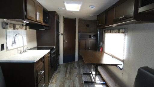 There are plenty of overhead cabinets throughout the travel trailer as well as outside storage and an outside LCD TV mount, and much more!