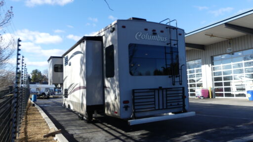 Triple slides, a rear living layout, and a rolling kitchen island are just a few of the items that make this Palomino Columbus fifth wheel unique!