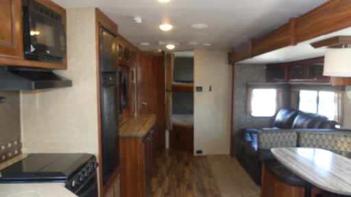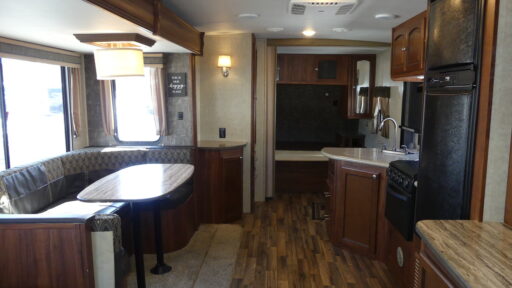 To the left of the entry door you will find an angled countertop with a double kitchen sink, three burner range, overhead cabinets, and a refrigerator. A pantry for your non-perishables and a closet are along the interior wall. The road side slide out features a u-shaped dinette, and a sofa with overhead storage providing plenty of seating, a place to enjoy mealtime, storage, and more.