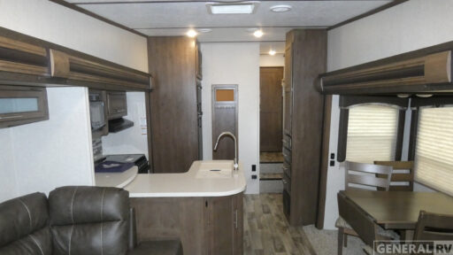Opposite, within the kitchen amenities slide there is a L-shaped sofa with storage above. Seated here you can easily enjoy conversation with family and friends, and also enjoy watching your favorite movies or television shows on the rear entertainment center that stretches across the entire width of the unit.