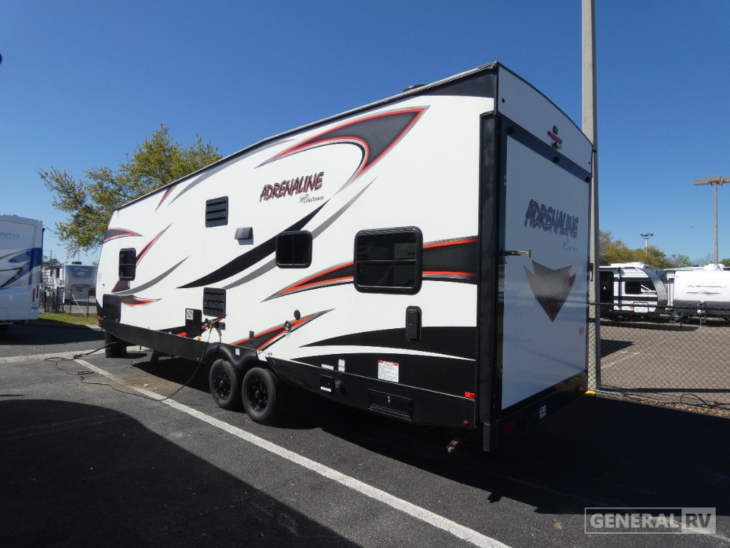 The front bedroom boasts a cozy queen bed, providing a restful retreat after a day of adventure. With the capacity to sleep six, thanks to the convertible sleeping options, this RV is ideal for families or groups. The 18-foot powered retractable awning extends your living space outdoors, offering shade and shelter. With an impressive cargo capacity and the ability to haul your favorite outdoor toys, the Adrenaline 25QB is your gateway to endless exploration. For more information, visit your nearest General RV dealership and start your journey today!